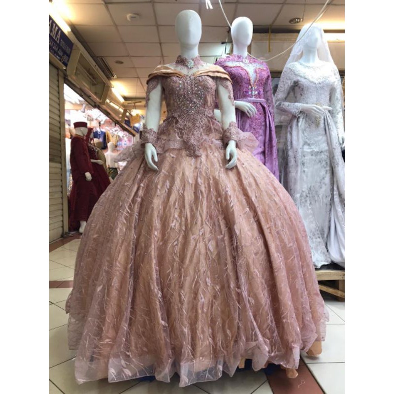 Baju gaun premium pengantin warna gold wedding dress full payet. Beli gaun pengantin muslimah modern dengan ekor warna rose gold. Kebaya pengantin mermaid rose gold.